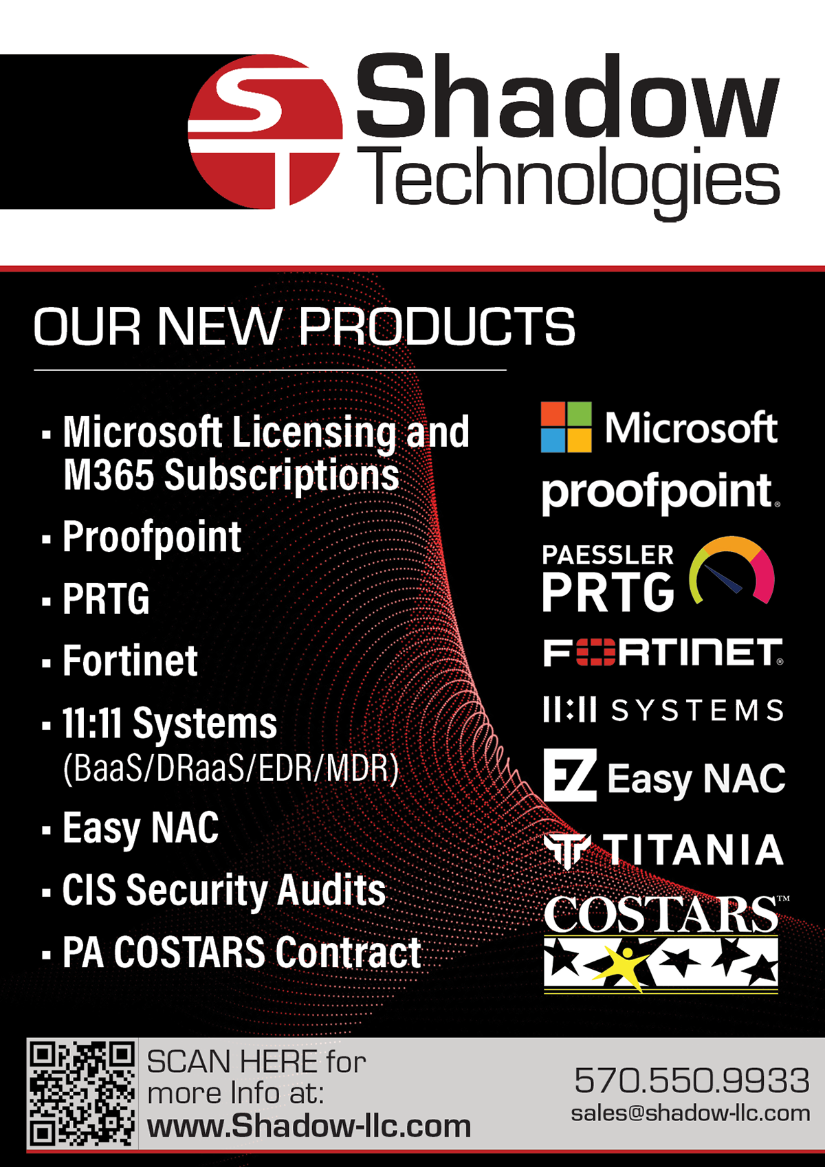 Tasked with making a fresh new look and feel through marketing design and a new revamped website to attract new clients. We wanted to showcase what they offer in one ad, and their new products within the other. Shadow Technologies is an IT Solutions company based in the Dallas, PA area. With my design approach, I wanted to show "connection" through imagery, but having a modern/futuristic edge to it. Using these specific vector backgrounds, this gave it that “techy” feel and showing a sense of working together in an abstract manner. Partnered with new-aged fonts and a breathable layout, this completed what I was looking for.
